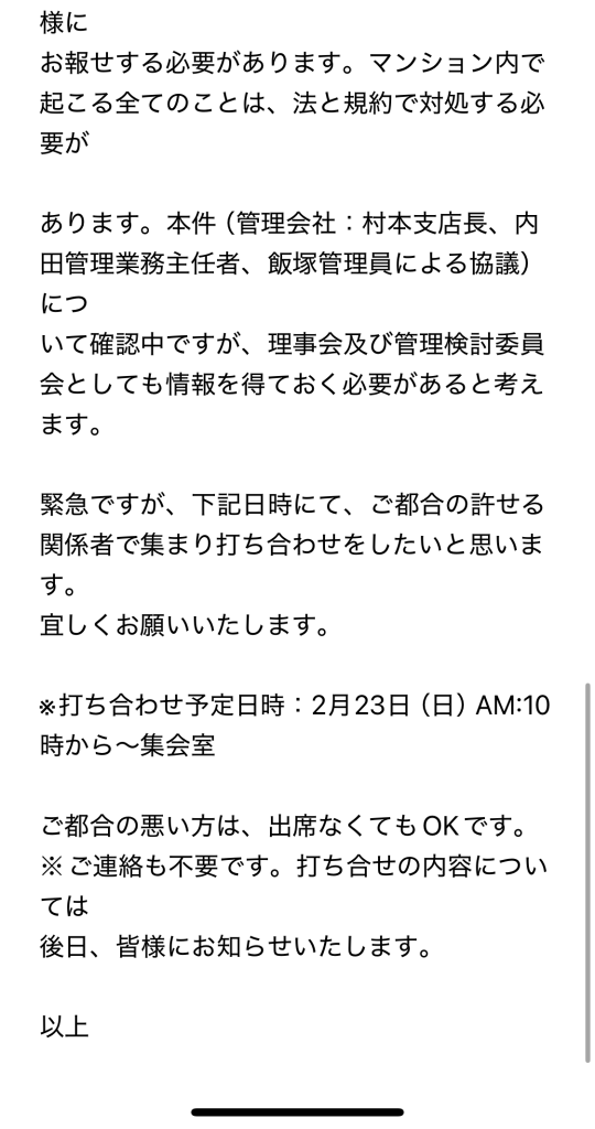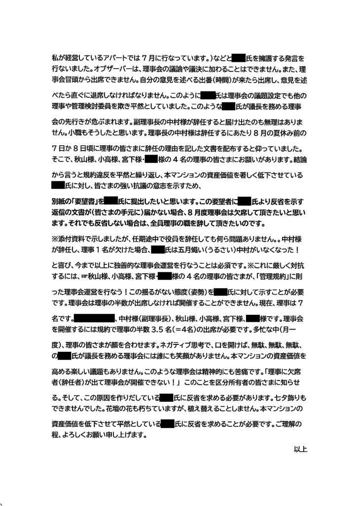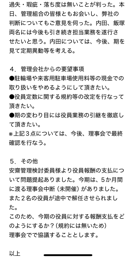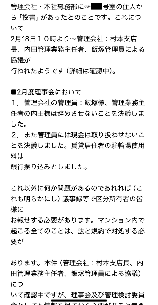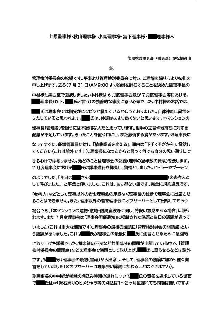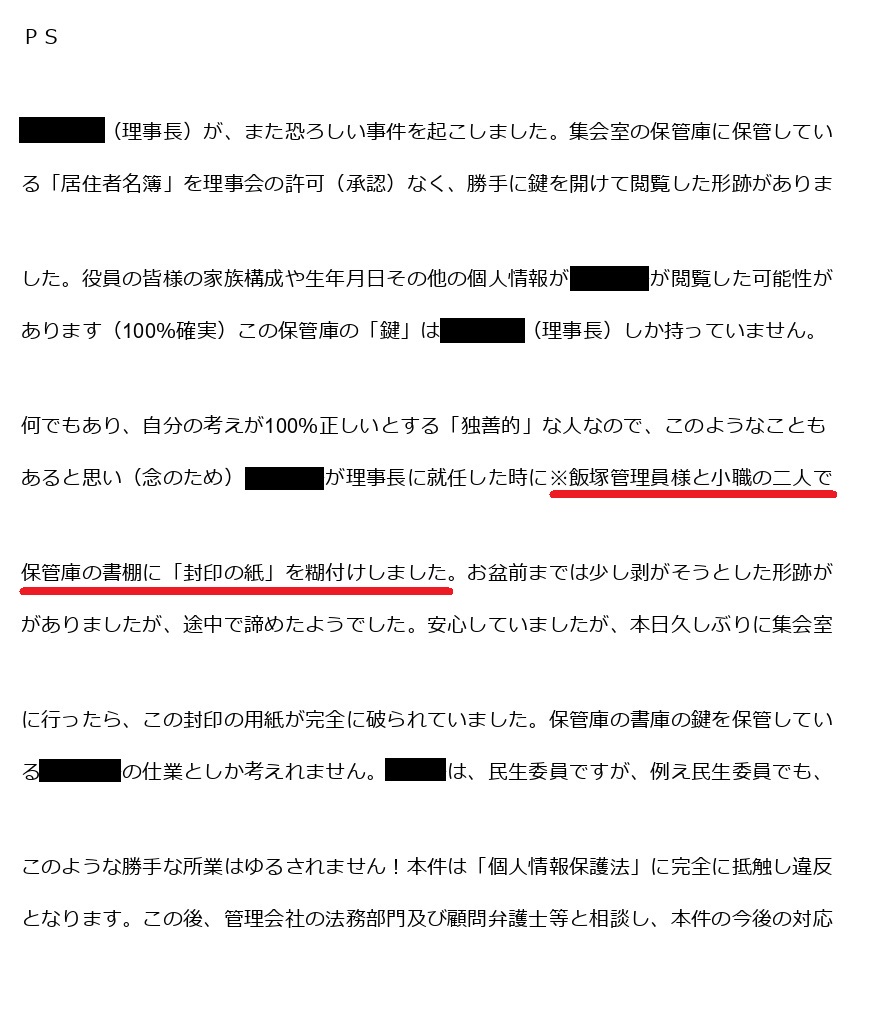 この副理事長は後期高齢者で、理事会でも「このじじい、ボケてないか?」と思われる言動が度々あったが、この奇行と文章を見て、完全にボケちゃってるなと確信した。