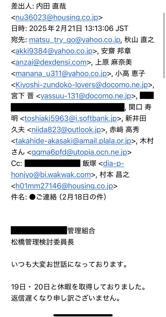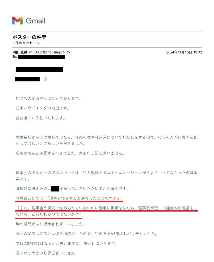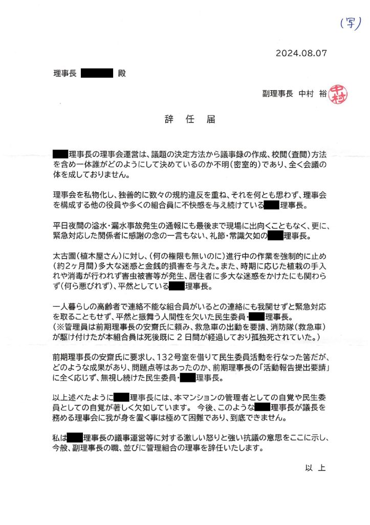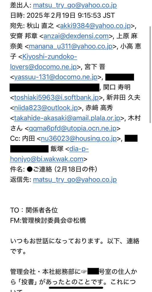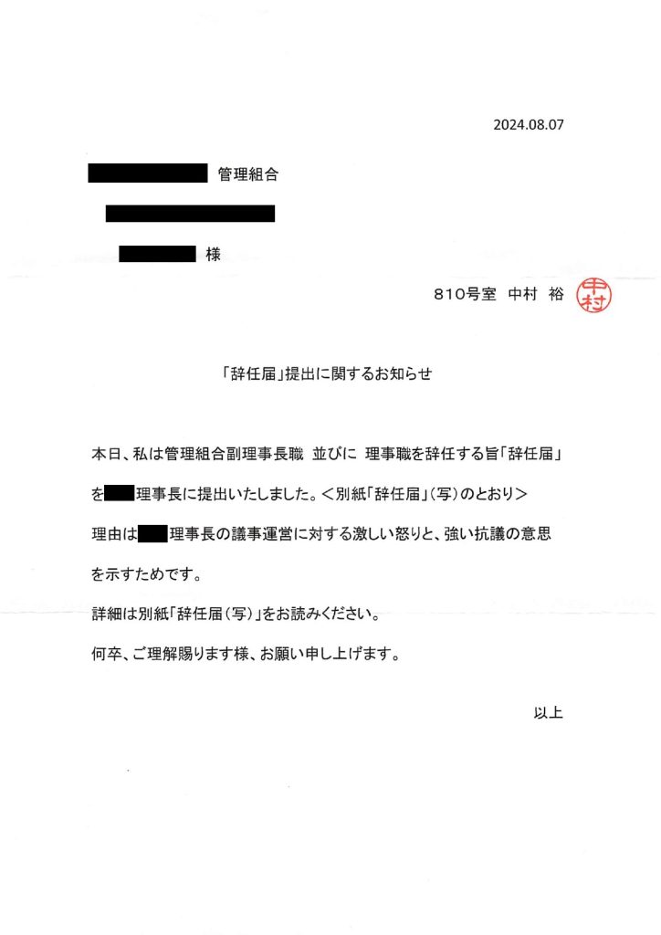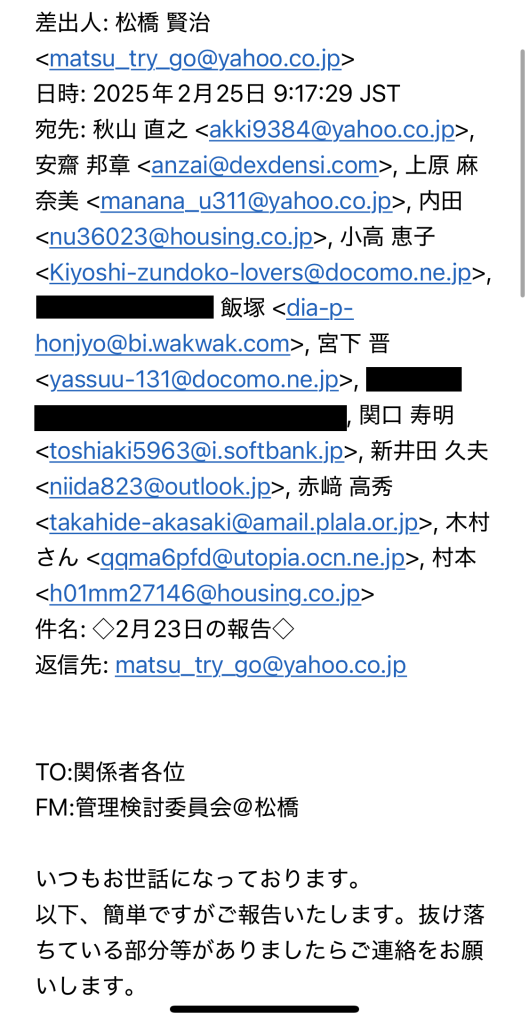 この副理事長は後期高齢者で、理事会でも「このじじい、ボケてないか?」と思われる言動が度々あったが、この奇行と文章を見て、完全にボケちゃってるなと確信した。