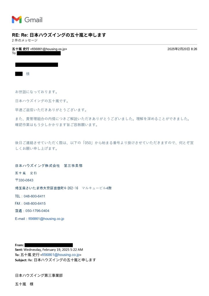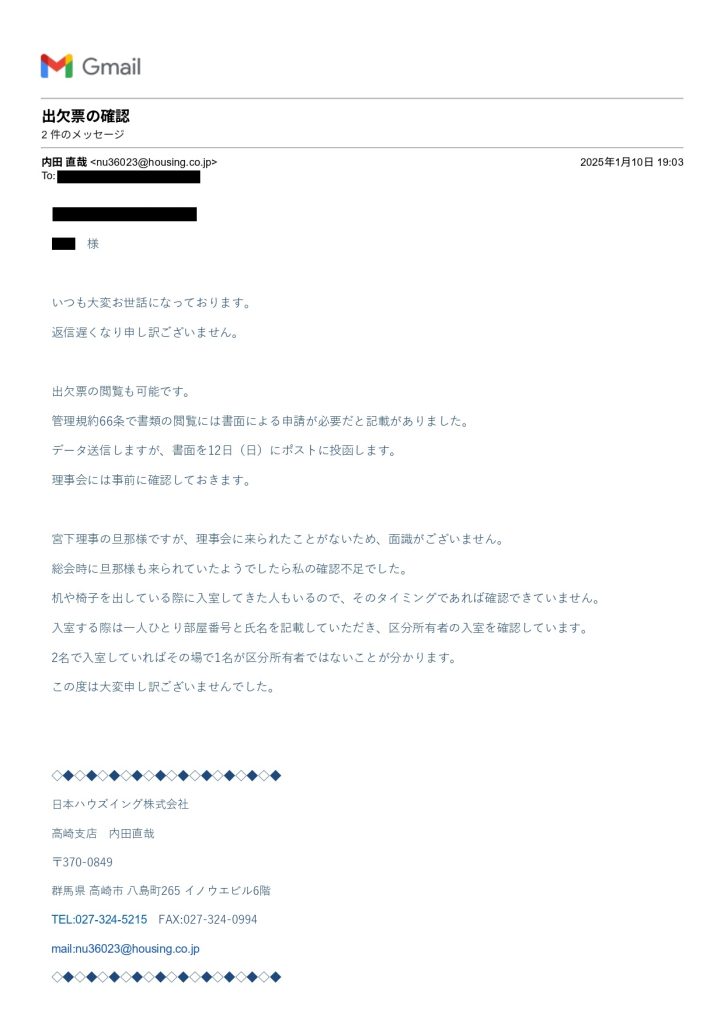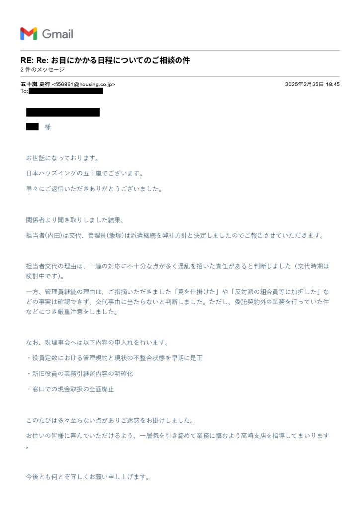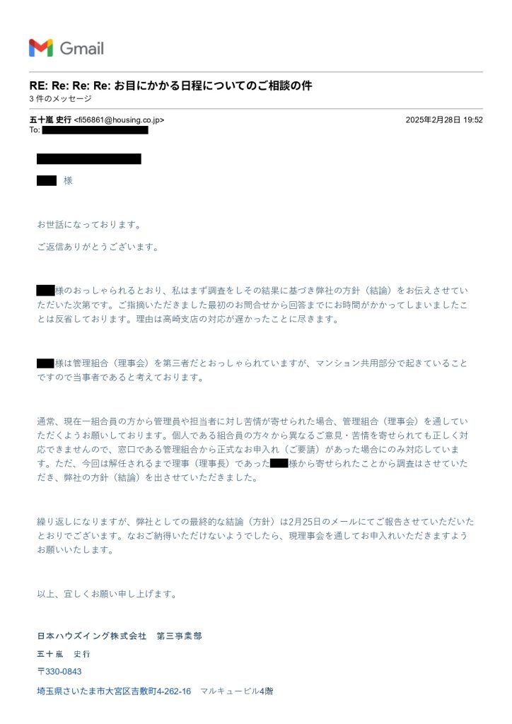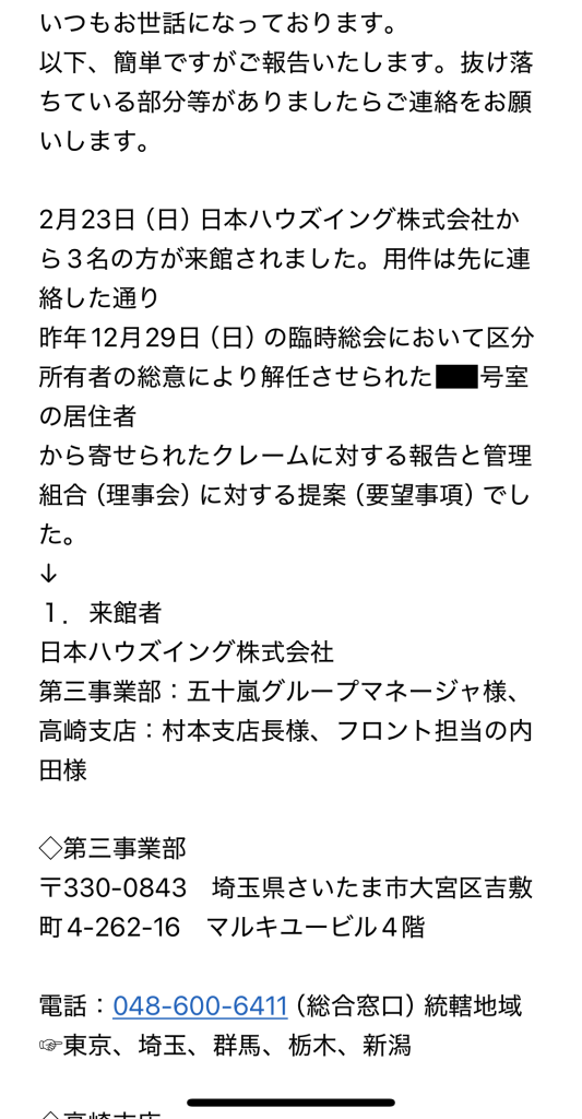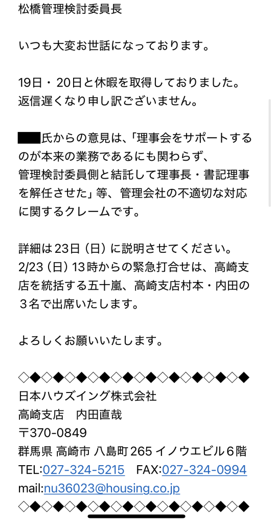 しかも日本ハウズイングから派遣されている管理員が不正行為を繰り返しており、その証拠を提示し対応を求めたにもかかわらず、担当者、高崎支店長ともに完全無視。