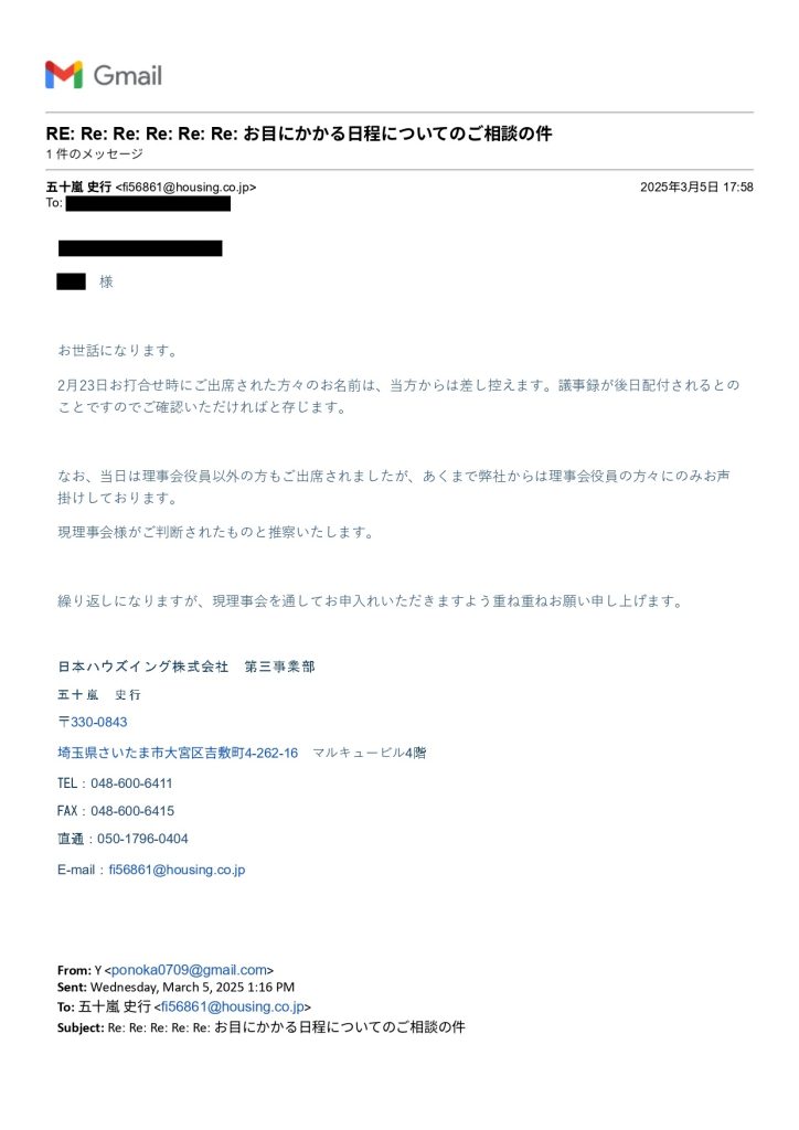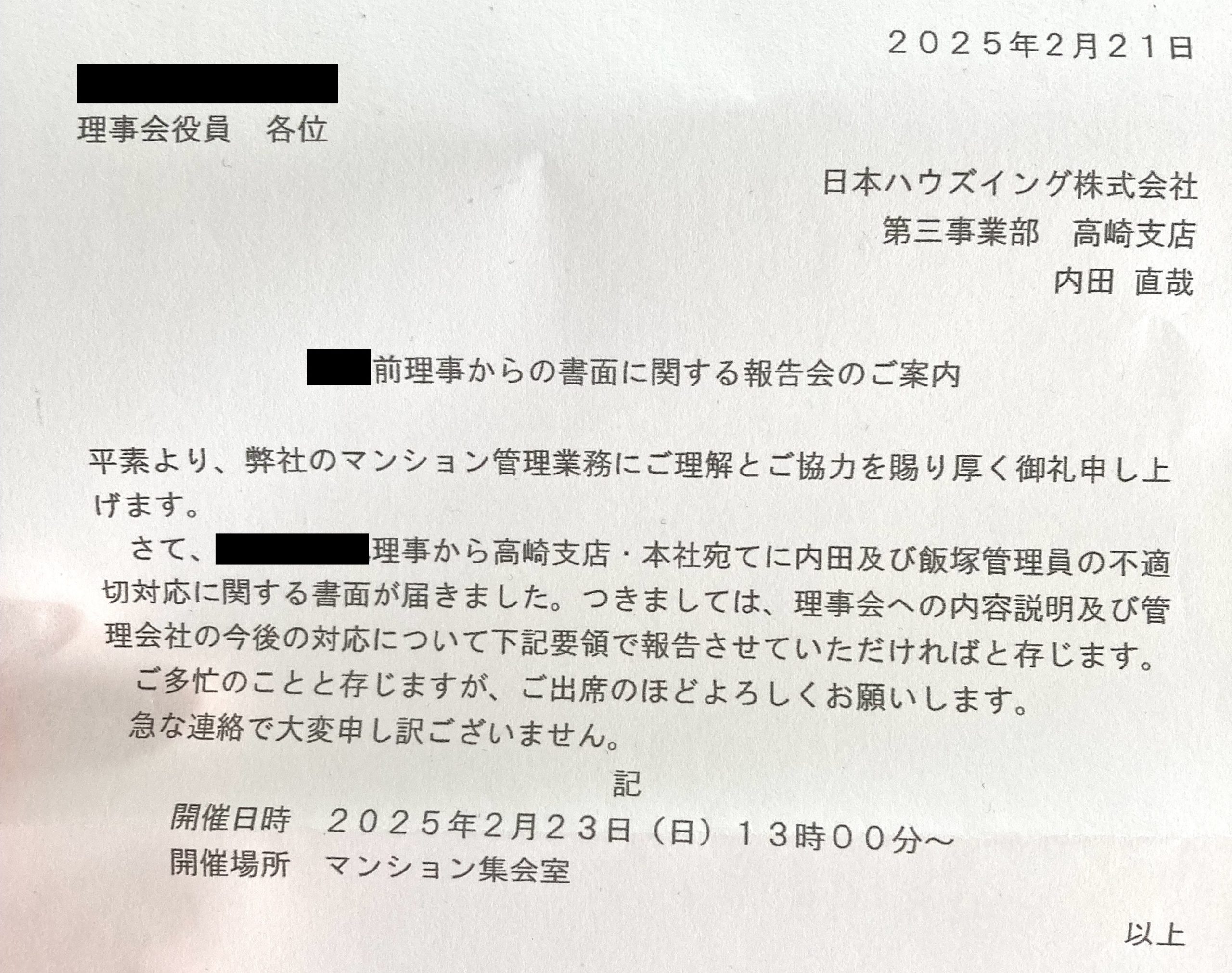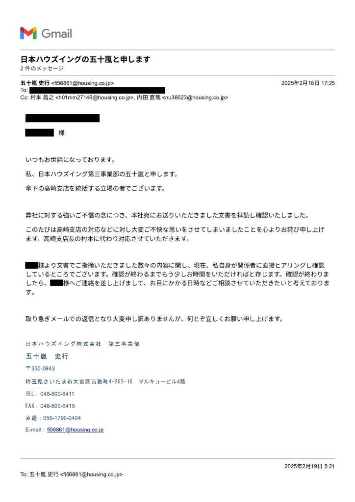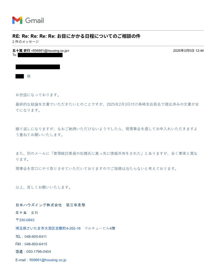 しかも日本ハウズイングから派遣されている管理員が不正行為を繰り返しており、その証拠を提示し対応を求めたにもかかわらず、担当者、高崎支店長ともに完全無視。