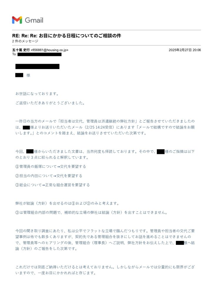 「あなたたちはいったいどちらを向いて仕事をしているのですか。御社と取引をしているのは管理組合であり、その管理組合の執行部は理事会です。その長が理事長です。その理事長の指示には従わず、嘘松の指示に従って動いているのはおかしいのではないですか」