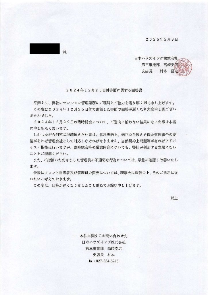 計3度のクレームで高崎支店の支店長から書面で返答が届くも、「総会について口出しする立場にない。管理員については早急に確認し対応する」のみ