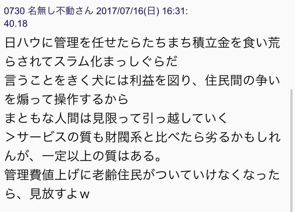 私がマンションの理事をやっていた2024年当時、住民トラブル(日本ハウズイングも加担)により理事会が約5か月間ストップしていた際、日本ハウズイングの担当者は「どうしていいかわからない」とアホ丸出しの発言をし、支店長に対応を求めるも、何一つ対応をしなかった。